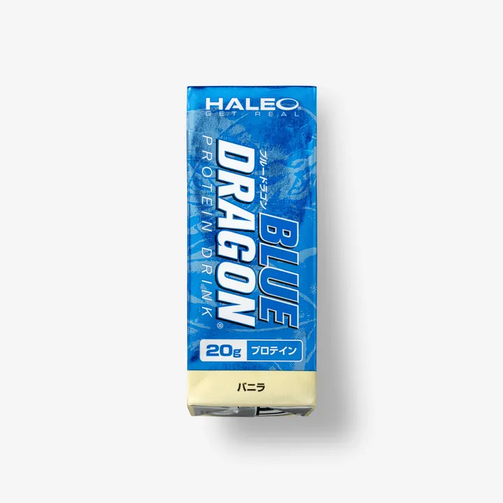 【10年愛され続けるプロテインドリンク ブルードラゴン、いつでも手軽にたんぱく質20gを!】 不足しがちなたんぱく質、あなたはしっかり補えていますか? たんぱく質は、筋肉、内臓、骨、皮膚など身体の組織を作る材料になるだけではなく、エネルギー源や神経伝達物質、ホルモン、抗体といった形で身体の機能調節・恒常性維持をするなど、生命維持に欠かせない最重要栄養素で五大栄養素のひとつです。ところが、たんぱく質の摂取量は、1995年にピークを迎え、2019年には平均71.4gと、戦後間もない1950〜60年と、ほぼ同水準になっていると言われています。健康的なライフスタイルを送るためにも、たんぱく質を意識した食生活を心がけてみましょう。 HALEOでは、2014年にブルードラゴンプロテインドリンクを開発・発売。当時は、200mlのサイズでたんぱく質20gが補給できる製品は珍しく、また製品名やパッケージデザインのインパクトから、プロアスリートやチーム、またボディメイクをするトレーニーに選ばれていました。しかし、そのたんぱく質含有量と飲みやすさが口コミで広がり、数年前より若い女性を中心に”お気に入りアイテム”としてSNSでの発信アイテムとしても評価いただいているアイテムです。 現在は、プロアスリートやチームはもちろん、女性やスポーツスクールに通うお子様にもご利用いただくブルードラゴンプロテインドリンク。牛乳と比較しても低カロリー、たんぱく質含有量は約3倍、カルシウム含有量も優れているので、万人にご活用いただけるアイテムです。 普段の食事にプラス1本のブルードラゴンプロテインドリンク。毎日の健康活動”ケンカツ”のお供にご利用ください。 カフェメニューやランチメニューにもプラスできる味わいなので、ショップメニューの一品としてもおすすめです。 <<ブルードラゴンプロテインドリンクの特長>> ●ミルクプロテインを採用しカゼインタイプのため腹持ちが良く、ダイエット時にもオススメ! ●200mlサイズで携帯に便利、手軽に20gのたんぱく質補給が可能! ●特殊製法で自然に近い形で製造、生乳由来のカルシウムや亜鉛などの微量栄養素が豊富! ■■■こんな方にオススメ!■■■ ✔ 偏った食生活でたんぱく質が不足気味の方 ✔ ハードな練習やワークアウトを行う方 ✔ ダイエットに励む方 ✔ 健康的なライフスタイルを送りたい方