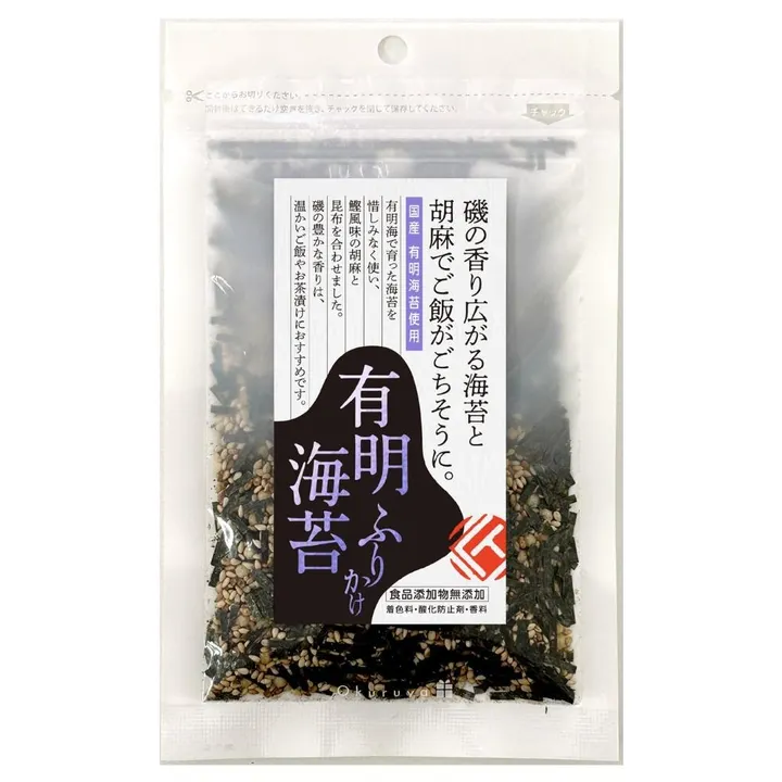 海苔の生産に適した場所である「遠浅の海」「潮の満ち引きが激しい」「海水と淡水が混ざり合う場所」で育った有明海苔がたっぷり入った磯の香り広がるふりかけです。 胡麻と昆布の旨味に天然塩で仕上げた、化学調味料不使用で安心してお召し上がりいただけます。 内容量:30g 原材料名:いりごま(国内製造)、あられ、焼海苔(海苔(有明海産)100%)、食塩、昆布粒、かつお節、砂糖、酵母エキス、しょうゆ(大豆・小麦を含む) 賞味期限:180日 栄養成分表示:(100gあたり)エネルギー/529kcal、たんぱく質/20.9g、脂質/36.8g、炭水化物/28.5g、食塩相当量/7.62g アレルギー:小麦、大豆、ごま お召し上がり方 ♦ふりかけとして 温かいご飯にかけたり、おにぎりに ♦冷奴にかけて ♦お茶漬けにしても美味しい ♦揚げ衣に混ぜて、磯部揚げ風にアレンジ ~iTQi (国際味覚審査機構) で優秀味覚賞を獲得。世界が認めた味~ ミネラル豊富な栄養塩が流れ込む恵み豊かな漁場で育った有明海苔のふりかけ。