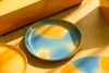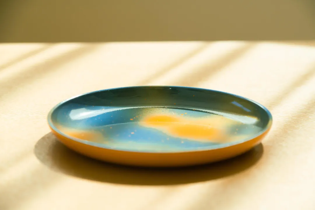 特徴的な変わり塗を表にした小物置きにも使えるお皿です。 石川県加賀市の加佐の岬から見る夏の終わりの夕焼けが反射して海の色と混ざり合ったデザイン。橙のグラデーションと海に差し込む光の変わり塗の両面塗装となっています。表面の変わり塗、裏面にも橙グラデーションとなっており、さりげなく「侘び寂び」を感じられるプロダクトです。