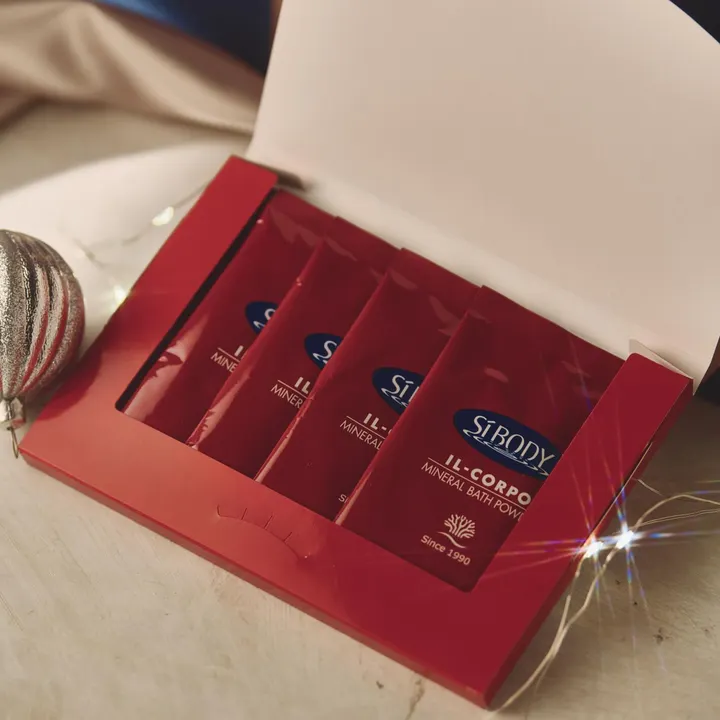 [資材の在庫逼迫に伴う一時受注停止について] ご盛況いただき、多数の注文をいただいたため資材の在庫が逼迫してしまったため、12月下旬頃までいったん受注停止いたします。 5包セット(トレッシングペーパー+ロゴシール)のご購入をご検討くださいませ。 ※年越ししての納入等で差し支えない場合は別途ご相談ください。 https://goooods.com/products/e45b30ca-2126-4553-bb86-de4ebf6ab103/29977f07-f1d4-4796-b76e-f63402f2d4bc goooods公式インスタでご紹介いただきました https://www.instagram.com/p/DQ54YrugWi0/?img_index=1 <ご注意事項> 本品は「卸用に特別価格でご提供している」分ですので、原則、直接贈答はお控え下さい。「お世話になっているお客様へのプレゼント品としたい、キャンペーンの景品としたい」場合は、必要個数と事情をご発注前にお問い合わせください。 <商品特徴> 面倒なラッピングは不要! 専用のマルーン色の化粧箱入り、ミネラルバスパウダーオリジナル分包(5包)セットです。 通常、トレッシングペーパータイプでお届けしている5包セットのギフトバージョンで、 しっかりとしたパッケージでクリスマスの時期にもぴったりな商品。 ・ 他社商品(タオル)等との組み合わせしてギフト訴求 ・ 店舗横でのお客様への販売 ・ 帰省時のお土産や季節ごとのギフト訴求時 などにもおすすめです。 【ミネラルバスパウダーの概要】 イルコルポのロングセラー商品で、沖縄県宮古島雪塩と海藻エキスを配合したバスパウダー(入浴剤)です。 保湿・整肌成分としてスクワラン・パパインを配合しており、うるおい逃がさず、お風呂上りはしっとりとした肌でお過ごしいただけます。 日々の喧騒を忘れて心身ゆったりとした気分になれるお風呂空間をご提供いたします。 <特長> 【POINT.1】ミネラルのヴェールでしっかり温まる!なのにうるおい逃がさない。 タラソテラピーにも着想を得て開発されている「ミネラルバスパウダー」は、沖縄県宮古島雪塩と海藻エキスを配合している点が一番のポイントです。 ミネラルヴェールのように肌をやさしく包み込むことで、入浴時の温かさを逃しにくい使用感が特長的な商品で、InstagramやXをはじめとするSNSでも「滝汗」「発汗」といったワードとともに紹介されることの多い商品です。 半身浴やサウナなどでじっくり汗をかくのがお好きな方にご好評いただいております。 <ここが違う!> 沖縄・宮古島の碧く澄んだ海から生まれた「雪塩」は、まるで粉雪のように繊細で、柔らかな手触りが特徴の高純度ミネラルソルト。 一般的な塩づくりで取り除かれてしまう“ニガリ”を含め、マグネシウム・カルシウム・カリウムなど、海のミネラルを豊かに含有しているのが特徴的な海塩です。(出典:株式会社宮古島の雪塩調べ) 【POINT.2】心と身体をリセット!深みと奥行きのある贅沢アロマ風呂。 [人気No.1]<オリジナルアロマ> イルコルポは「海の恵み」をテーマにしており、オリジナルアロマは「清涼感あるタラソ香り(マリン系)」になっています。 リフレッシュやリラックス成分の多い「ユーカリ」をベースに、ベルガモットやオレンジ、レモンなど、すっきりとした香りです。 お湯に溶かすと薄く透き通ったアクアマリンのお湯になります。 海風のような心地よさが広がり、深呼吸したくなるような安らぎ感を与え、ユーザーの方からも「この香りが何よりもお気に入り」とお声をいただくことが多いです。 【POINT.3】「Made in Japan」のみならず、「日本各地に息づく素材」にもこだわった商品です。 ミネラルバスパウダーをはじめ、SiBODYの商品は日本国内製造しています。ミネラルバスパウダーオリジナルは沖縄県産雪塩をキー成分として配合しています。