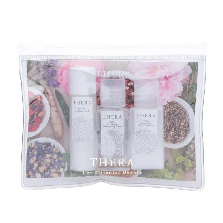 まずはお試しに!和漢と発酵 日本古来の智栄と素材を活かしたエイジングスキンケアのミニセット(クリア肌セット) ※クリア肌セットのみの卸販売についてはブランドのアイテムロット数ではなく業務用ロットとさせていただきます※ 「まずは試してみたい!」「スキンケアアイテムを持ち歩きたい!」というお声から実現した、THERAの和漢発酵エイジングスキンケアセット。人気アイテムの酵素のあらい粉(あお)・和漢発酵化粧水・和漢発酵美容乳液のミニサイズ(2泊3日程度にお勧め)のセットです。うるおいを保ちながらも汚れをしっかりと落とす酵素洗顔、化粧水と乳液のベースとなる保湿アイテムで、うるおい、ふっくらとした弾力、ハリと輝きに満ちたお肌へ。