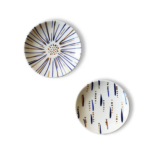 呉須を使った金群青シリーズの豆皿ペアセット。 オリジナルの箱に入った贈り物におすすめのアイテムです。 水から生まれる生命力や儚さを、色鮮やかな群青色ときらめく金彩で表しました。 来客時やお祝いの席などハレやかな場にも合う、華やかな仕上がりの器です。