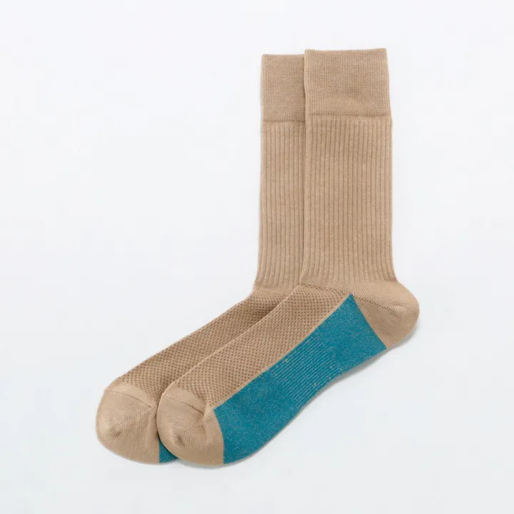 ポリエステルに綿を巻き付けた特殊な糸を開発。 軽さとやわらかさ、頑丈さという相反する機能を追い求めた靴下。 足底部分は外側をナイロン糸補強をすることで、靴との擦れに耐えるよう頑丈さを求めた。 46%POLYESTER, 35%COTTON, 18%NYLON, 1%POLYURETHANE 日本製