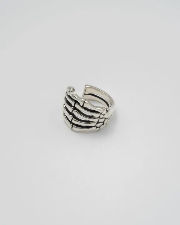 "Skeleton" series 人骨を忠実に再現した、骨の手が指を掴むような形のリング。 高度な彫刻技術で生み出されたシンプルながらも迫力のあるScat独自のデザインです。 艶出し加工によるSILVER925(sterling silver)の独特な光沢に加え、燻し加工を施しています。 リング内側中央には、ロゴの刻印を施しています。