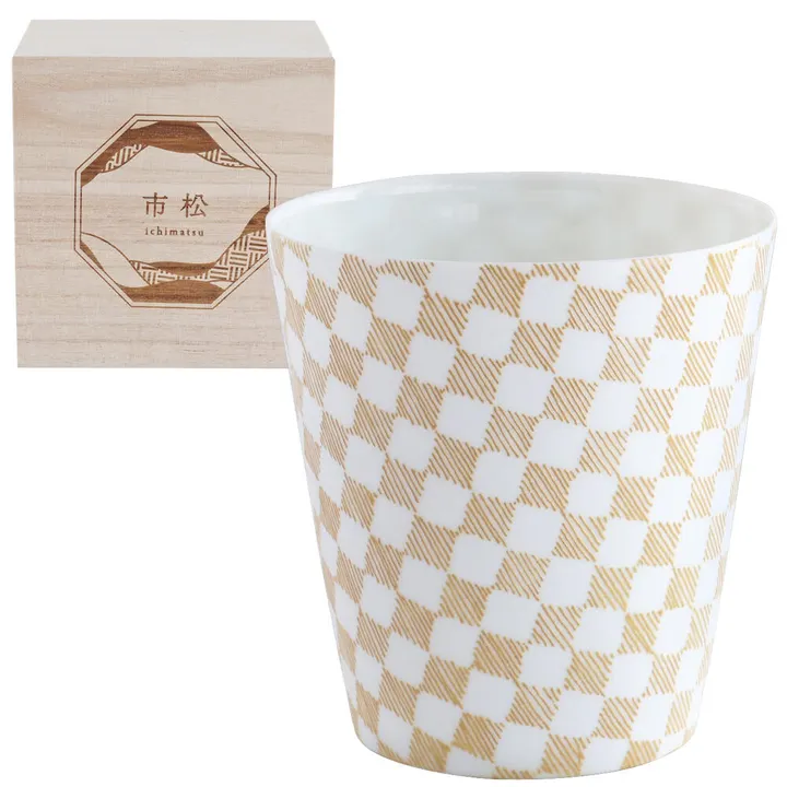 【フリーカップ】縁起カップ 透けるほど薄い磁器のタンブラー 市松柄 美濃焼 ゴールド