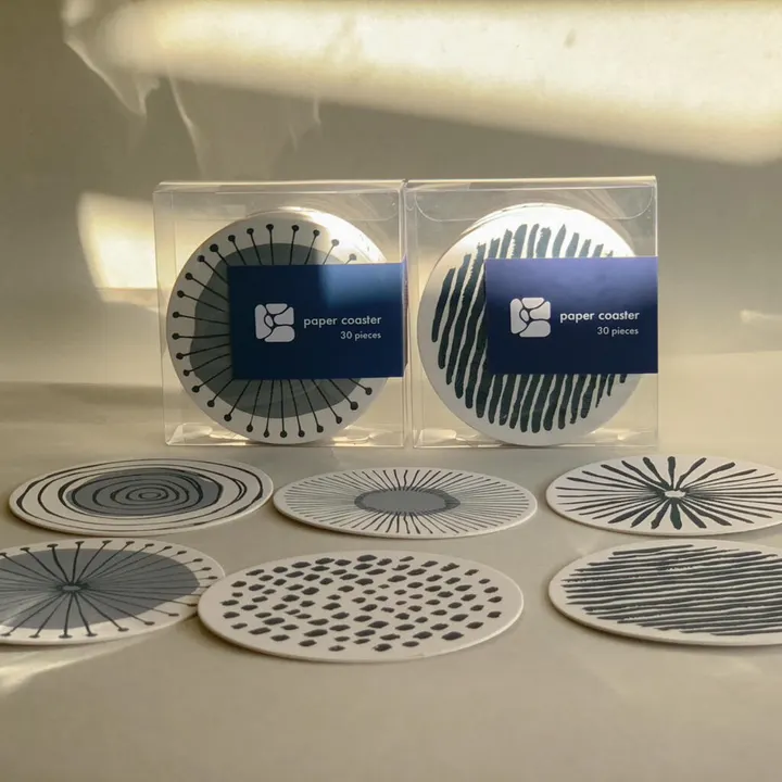 厚さ約1mm 直径9cmの紙コースターのセットになります。 高吸水性の専用紙を使用しており、コップやペットボトルの水滴をしっかり吸いとります。 デイユースはもちろん、ホームパーティを開いたり、仕事でのちょっとした来客への対応時。 はたまたキャンプやバーベキューといったアウトドアなど、様々な場面での使用が想定いただけます。 そして使用した後は捨てるだけ。 面倒な後片付けもなく楽ちん。 10枚セットはチャック袋 30枚セットはクリアケース付きで持ち運びにも便利です。