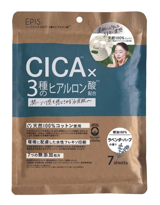潤い・ハリ感を感じさせる“水光肌”へ 天然100%コットンを使用した、肌にピタッと密着する優しい肌触りのシートマスクです。CICAと3種のヒアルロン酸が潤いを与え、ハリ感のあるみずみずしい素肌へ整えます。 ラベンダーハーブの香り
