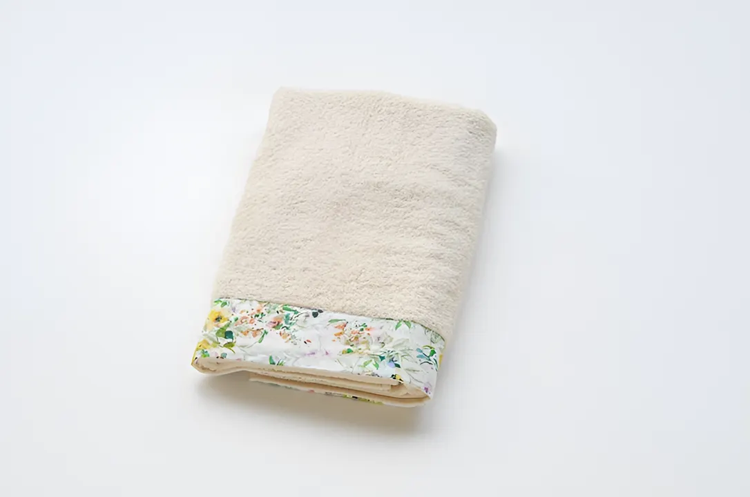 インクジェットの花柄プリントが魅力のフェイスタオル。 34×90cm、綿100%、日本製、 ヘム部分の鮮やかな花柄プリントが印象的な、エレガントでフェミニンなタオルです。しっとりやわらかな肌ざわりと、洗うほどふっくらやわら かくなるタオル生地。可憐さと力強さを感じさせる花柄がよく映えます。 今治タオルブランド認定商品