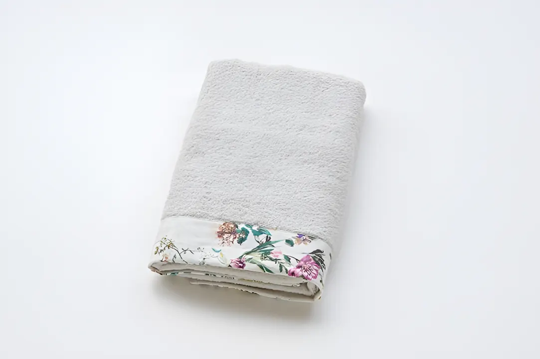 インクジェットの花柄プリントが魅力のフェイスタオル。 34×90cm、綿100%、日本製、 ヘム部分の鮮やかな花柄プリントが印象的な、エレガントでフェミニンなタオルです。しっとりやわらかな肌ざわりと、洗うほどふっくらやわら かくなるタオル生地。可憐さと力強さを感じさせる花柄がよく映えます。 今治タオルブランド認定商品