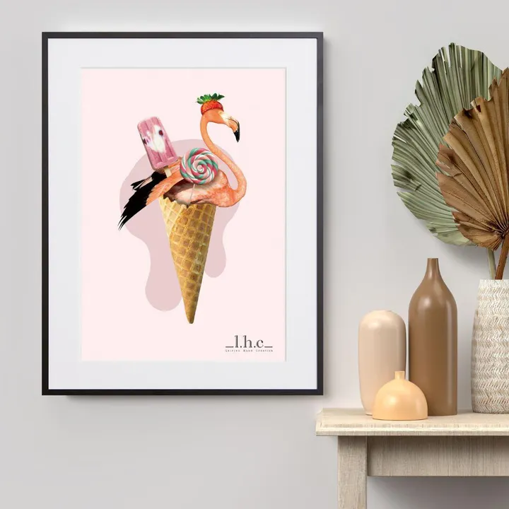 アーティスト -PROFILE- Yuria Oku(ユリア オク) Leirion Hand Creation 北海道出身 アートディレクター/デザイナー 広告やグラフィックデザインの仕事をしながら、自身ではコラージュアートや写真撮影、イラストなど幅広く活動。 写真とイラストのコラージュや合成など現実にはない、不思議で奇妙な作品を得意とする。 ファッション広告を想定とした作品も制作している。 【作品について】 作品名:Flamingo ice 手法:デジタル、コラージュ ペーパー:高品質半光沢紙 マットカラー:白 マット*:DXホワイト芯 100%バージンパルプ/PH7・中性紙(2mm厚) ※全てのアートにマットがつきます フレームカラー:黒、白、無垢(3種類から選択) ※マット付のため通常とはフレームサイズが異なる規格となります。 【マット*とは?】 アートポスターの周りに挟んだ厚紙の事。 マットを使わない時に比べ余白により広がりが生まれ、作品の新たな一面を引き出せ作品の見栄えがグッと良くなります。また、額縁のガラス面と作品が直接触れたままにしておくと、くっついて作品を傷つけることがあります。マットを使用することでガラスと作品の間に空間ができ、作品を保護することができます。ブランドコンセプトにより全てのアートにマットがつきます。 ー ファッションのようにアートを ー 私達が掲げるコンセプトです! 毎日着替えるファッションの様に、アートも気軽に飾り変えて欲しい... 一旦飾り終えたアートにも光を当ててほしい... ポスター単体、またはリピートで中身だけのポスターを購入された方に"専用のハンガー"をセットでお届け。 「今までに無い!新しいアートの飾り方を提案」 飾る事がなくなった前のアートをハンガーにかけて洋服と一緒にかけてもらう。 その日の気分や、モチベーションですぐに取り換えられる様に。 もちろん、魅せる収納としても今までにないおすすめの飾り方です。