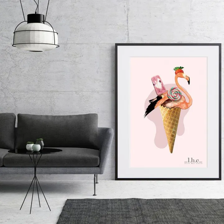 【現代アートポスター】アイスクリーム フラミンゴ アイスキャンディー 大人可愛い 写真コラージュ A2(L) フレームセット:黒 55.1×73.3cm