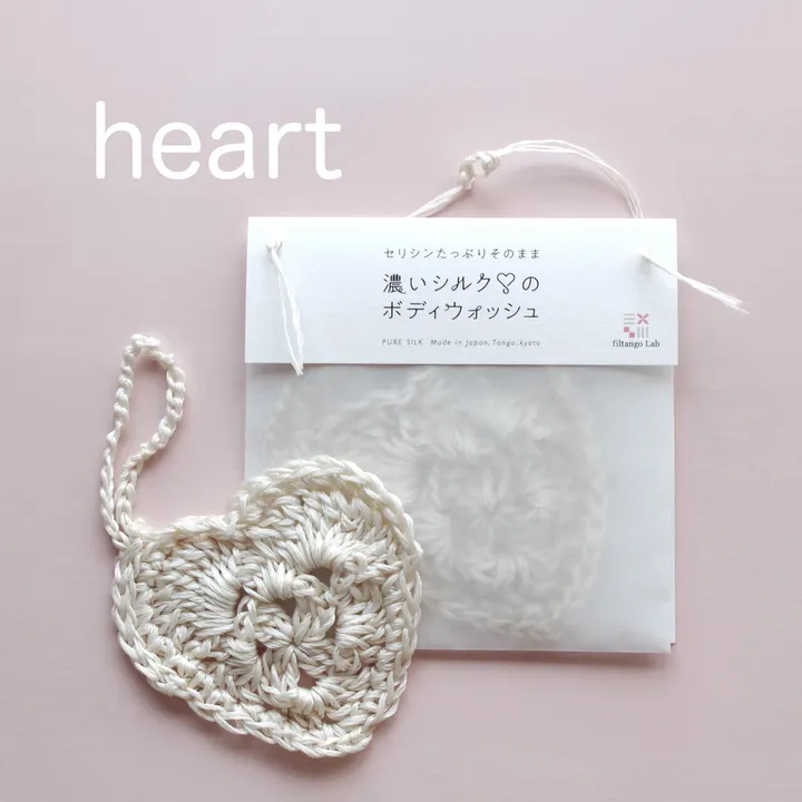 お風呂時間に、毎日の手洗いに!絹の成分 ”セリシン” がたっぷりのボディウォッシュ。 <ハート heart>は毎日の手洗いやお子様向けにぴったりの小ぶりなデザイン。 【使用方法】 普段お使いの石鹸やボディソープとともにお使いください。使用後はよく洗って絞って、吊るして乾かしてください。時々、洗濯して天日干しするのがおすすめです。素材は天然の素材のみで作られています。防かび剤などの化学物質は一切使用しておりません。 【商品の特徴やものづくり背景】 京都、丹後、創業100年の高級和装織物の丹後ちりめんをつくる工場での製造過程で絹の原料の蚕、繭にもともとついているセリシンという美肌成分を、加工により充分に引き出して糸をつくっています。セリシンを残したままで作られた糸、というのが商品の最大の特徴で、他社ではできない技術。もちろんシルク100%、天然素材そのまま、シルクは人間の肌と同じタンパク質からできています。商品は、編み物が得意な丹後在住の高齢者の方が一つ一つ編んでいます。触るとセリシンの風合いでシャリシャリしていますが、お湯につけると柔らかくなります。繭から引き出した極細のシルクの糸が150本あまり束ねられているので、泡立ちもよく、繊維が肌の細かい部分に行き届き、角質を落とします。