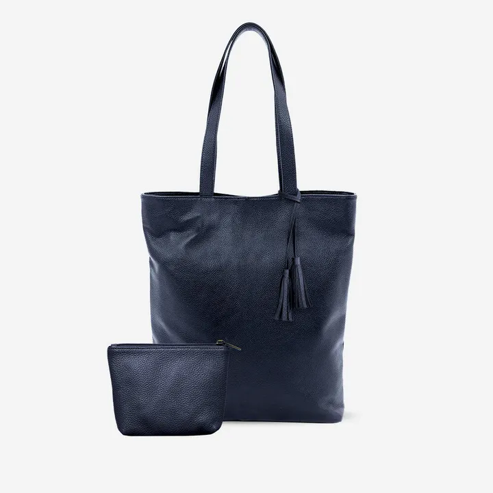 ポーチ付き 本革 縦型ジッパートートバッグ ネイビー
