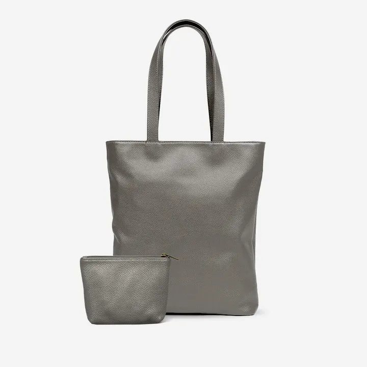 ポーチ付き 本革 縦型ジッパートートバッグ グレイ