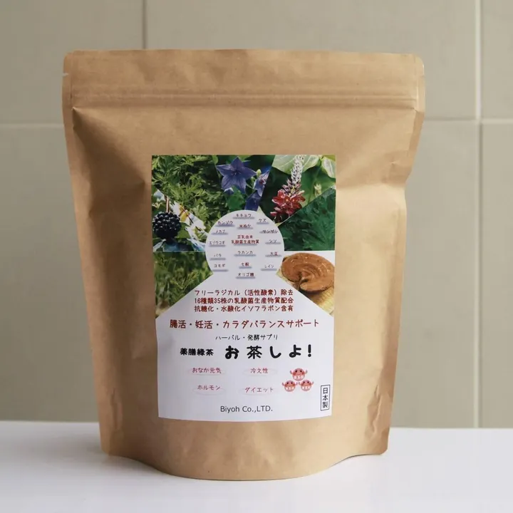 カテキンやポリフェノールを含む緑茶をベースに、米ぬかや大豆、くず、メカブ、シソなど日本人の食卓に古くからある素材を組み合わせて作りました。お腹の元気をサポートする乳酸菌生産物質も配合。飲みやすくするためにお腹にやさしいオリゴ糖を加え、水に溶けやすい顆粒タイプにしあげました。持ち運びが便利なようにスティックタイプに加工しましたので、どこでもお召し上がりいただけます。 保存料、着色料は一切使用しておりません。 ご利用方法 ぬるま湯や水に溶かして、あるいはそのままお召し上がりください。 食品のためお好みの量をお召しあがりください。1日1~3本が目安です。 使用上の注意 ビタミンなどの栄養素を濃縮したものではありませんので、大量にお召し上がりいただいても体に悪影響はございませんが、体の具合によって、薬の効き目や体調に影響を及ぼす可能性があります。お薬をお飲みになっている方や体調に不安があり、医師の治療を受けている方は、安全のため事前に医師にご相談ください。 薬膳緑茶お茶しよ!には、緑茶の他、大豆や米胚芽、クズ、シソ、よもぎ、めかぶ、ラカンカ等様々な原料を17種類配合しています。