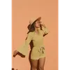 品名:Blooming The Flower Romper 美しい花々にインスパイヤされデザインされた袖のフレアには、"一人一人が抱いている夢が叶い、お花のように咲き誇りますように"という願いが込められています。お花が咲くように、あなたの日々がより美しく、豊かに。そして女性らしさを引き出す大胆なバックシルエットと袖のフレアデザインでボヘミアンスタイルを表現。 ビーチや自然の中でのシーンはもちろんロンパースの上からフレアデニムやパンツ、スカート等を履いて頂くとトップスとしても着ることができる為シティーコーデとしても楽しんで頂けます。 肌見せに抵抗がある日本ではなかなか無いデザインの為、おしゃれが大好きな女性からの支持が多く、 コーディネート次第では肌見せを調整できるうえ、着る度に自分のサイズにあっていく為どんどんと愛着が 湧くという嬉しいお声も多く頂いている人気アイテムです。 特徴1 GOTS認証済みのオーガニックコットン生地をベンガラ(土)で染め、自然素材だけにこだわり、 使い古した洋服は土に埋めてもらうと地球に還る、地球循環型のお洋服です。 特徴2 どの型の洋服も2way~4wayで着ていただけるようデザインを工夫しており 1着あれば様々なコーディネートを楽しんでもらえます。 特徴3 お客様が普段お持ちのインナーを活用できるコーディネートをご提案することで サマーシーズンのみならず、春秋冬でもご愛用頂いています。 特徴4 GOTS認証済みのオーガニックコットン素材を使った高島ちち"みの生地は 使えば使うほどに柔らかくなりその人の肌に馴染むことが特徴で、お肌の弱い方にも 安心して着用いただいています。 特徴5 高島ちち"みは伸縮性のある生地の為、着れば着るほどに自分自身の身体に フィットしたサイズになってくれます。お客様からもこのようなお声を沢山頂いており、 フリーサイズ 展開でも生地の特徴を活かしそれぞれの体型に合わせた唯一無二の お洋服となっています。