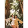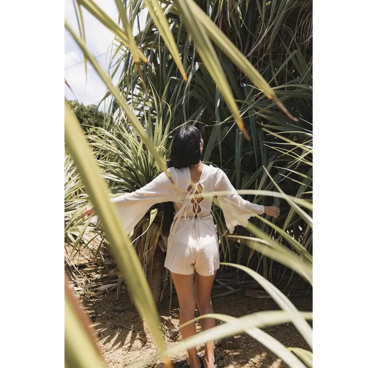 品名:Blooming The Flower Romper 美しい花々にインスパイヤされデザインされた袖のフレアには、"一人一人が抱いている夢が叶い、お花のように咲き誇りますように"という願いが込められています。お花が咲くように、あなたの日々がより美しく、豊かに。そして女性らしさを引き出す大胆なバックシルエットと袖のフレアデザインでボヘミアンスタイルを表現。 ビーチや自然の中でのシーンはもちろんロンパースの上からフレアデニムやパンツ、スカート等を履いて頂くとトップスとしても着ることができる為シティーコーデとしても楽しんで頂けます。 肌見せに抵抗がある日本ではなかなか無いデザインの為、おしゃれが大好きな女性からの支持が多く、 コーディネート次第では肌見せを調整できるうえ、着る度に自分のサイズにあっていく為どんどんと愛着が 湧くという嬉しいお声も多く頂いている人気アイテムです。 特徴1 GOTS認証済みのオーガニックコットン生地をベンガラ(土)で染め、自然素材だけにこだわり、 使い古した洋服は土に埋めてもらうと地球に還る、地球循環型のお洋服です。 特徴2 どの型の洋服も2way~4wayで着ていただけるようデザインを工夫しており 1着あれば様々なコーディネートを楽しんでもらえます。 特徴3 お客様が普段お持ちのインナーを活用できるコーディネートをご提案することで サマーシーズンのみならず、春秋冬でもご愛用頂いています。 特徴4 GOTS認証済みのオーガニックコットン素材を使った高島ちち"みの生地は 使えば使うほどに柔らかくなりその人の肌に馴染むことが特徴で、お肌の弱い方にも 安心して着用いただいています。 特徴5 高島ちち"みは伸縮性のある生地の為、着れば着るほどに自分自身の身体に フィットしたサイズになってくれます。お客様からもこのようなお声を沢山頂いており、 フリーサイズ 展開でも生地の特徴を活かしそれぞれの体型に合わせた唯一無二の お洋服となっています。