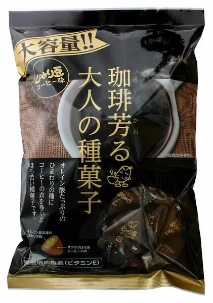 お菓子専用として栽培された品種のひまわりの種にコーヒー味の衣を巻きました。 甘さ控えめちょっぴりほろ苦い大人向けの味付けです。 オレイン酸が豊富に含まれており、おやつやお茶うけ、お酒のおつまみなど様々なシチュエーションにぴったり!! 一度食べたらクセになるそんな種菓子です。