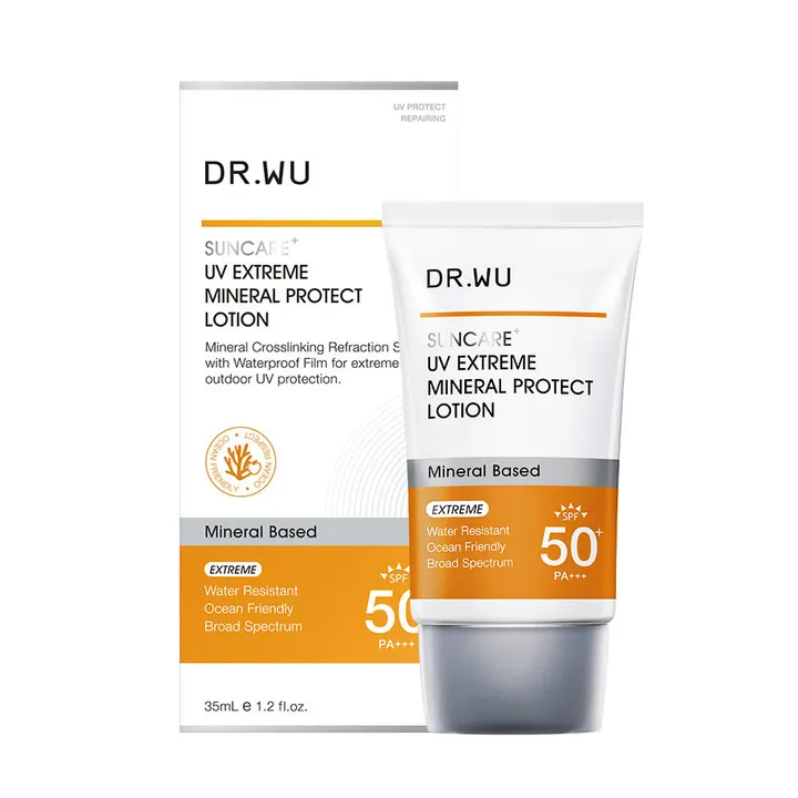 【DR.WU(ドクターウー) 日焼け止め ウォータープルーフ】 UV EXTREME MINERAL PROTECT LOTION (35ml) エクストリーム ミネラル プロテクト ローション SPF50+・PA+++ / 汗や水に配慮したオイルコーティング処方で、肌にぴたっと密着。 うるおいを守りながら、日差しの強い日も快適に使えます。 強い日差しによるダメージを和らげ、バリア機能をサポートし、肌の耐久性を向上させます。