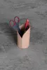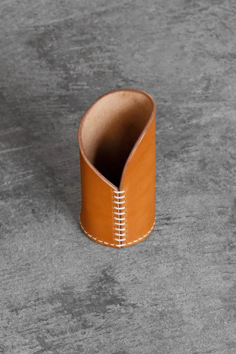 ひと味違う、アシンメトリーデザインが目を引くレザーペンスタンド。 すべて職人の手縫いで仕上げた、温もりと上質感のある逸品です。 ペンスタンドとしてはもちろん、メガネスタンドや小物入れとしても活躍。 置くだけで空間に凛とした存在感を添える、実用性とデザイン性を兼ね備えたアイテムです。 Material:Oil leather Size:H120 × W60mm ※天然皮革を使用しているため、記載の数値と多少の誤差が生じることがあります。 【注意事項】 ・商品のお色はPC環境によって多少色合い、見え方など違ってまいりますのでご了承ください。 ・部位によっては牛が元々持っていたしわや小さな傷がありますが、自然の風合いとしてお楽しみください。 ・職人が一つ一つ手作業で製作していますので革の表情は少々異なる場合があります。