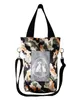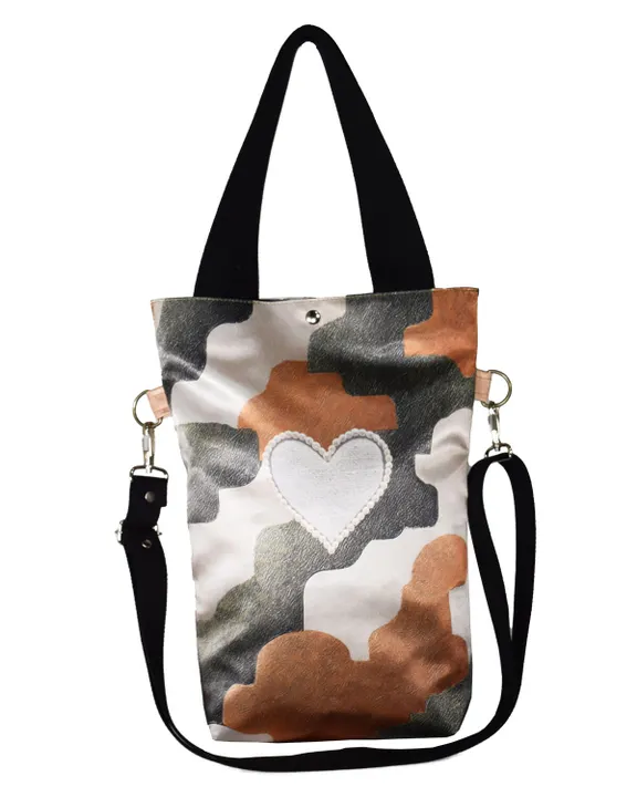 ティピィカレンのサテンスエードハートモチーフ縦長トートバッグ このトートバッグは、手持ちだけでなく、ショルダーベルトも付いているので、斜め掛けもでき様々なシーンに対応できます。縦長のサイズですので折り曲げてボディバッグのような使い方もGOOG! 開口部はマグネット仕様、底マチも8cmありますので、お仕事やデイリーユースにA4サイズの書類が縦にしっかり入ります。 お洒落なレッスンバッグなどにもいいと思います。 持ち手は5cmと幅広テープでしっかりして、持ち手の高さも21cmでワンハンドルで方にしっくり安定感があります。 サテンスエードのポリエステル素材は、中肉素材で、硬さもあり丈夫で、軽さを追求しています。光沢のある特徴をデジタル染色でオリジナル柄を施していますので、他にない高級感とユニークなバッグになっています。 表は茶系のカモフラージュにハートモチーフの刺繍柄、裏は変わりカモフラージュに犬猫刺繍をポケットにしています。 なんか楽しくなる、軽くて便利そんなバッグに仕上がっています。 インテリアファブリックにいろんな柄をデザインしカラフルで、こんな柄見たことない、楽しくなるバッグに仕上げています。また見た目からは驚くほどの軽量な素材なので、長時間の持ち運びも疲れにくく、使い勝手抜群です。 また、デザインにこだわって作られたこのハンドバッグは、どんなコーディネートにも馴染みます。シンプルな服装にさり気なく可愛らしさをプラスしたい時や、個性的なスタイリングを楽しみたい時にオススメです。 ※ハンドルやショルダーストラップの長さは調節できます。商品画像と実際の色合いは多少異なる場合がありますので、ご了承くださいませ。 デジタル染色とは デジタルデータをインクジェットプリンターにより、高精細に描画し昇華転写染色の技術により布を染色する加工方法。 使用する染料インクは顔料系インクとは違い、布の風合いを損ねず色落ちなどもほとんどありません。 分散染料による熱転写染色方式のためポリエステル素材への染色となります。 高発色、高精度のオリジナルテキスタイルに仕上がっています。