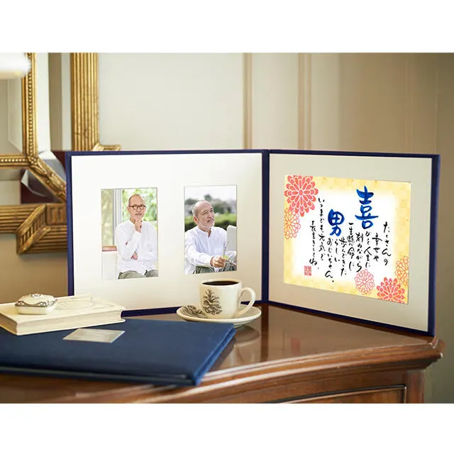 お名前(フルネーム)、記念日、「祝 ○○」(還暦、喜寿、米寿など)が記載されたプレートが表紙を飾ります。 家族写真やお気に入りの写真と一緒に飾れる賀寿のお祝いにっぴったりなアルバムです。 長寿祝い(還暦祝い・古希祝い・喜寿祝い・傘寿祝い・米寿祝い・卒寿祝い・白寿祝い・百寿祝い)や敬老の日のギフトにオススメです。 アルバムカラーは2色からお選びいただけます。 お仕立券でのご提供となります。 【お仕立券のご利用の流れ】 1.お仕立券ご利用のお客様が申込用紙に必要事項をご明記いただき、弊社へ直接FAXまたは郵送にてお送りいただきます 2.弊社へお仕立券が届き次第、ご注文内容を確認しネームインポエムの作成に入ります(詳細に不明点がありましたら、直接お客様へ問い合わせします) 3.商品作成後、約2週間程で作品をお届けいたします