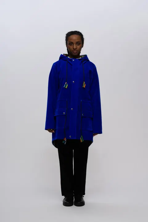 「アフリカファッション」の中でも、表地はベルベット、裏地には「アフリカ布」を使用することで、「カラフル」と「シック」を併せ持ちそれが個性となっています。 ■デザイン 見た目は繊細なベルベット生地で、着心地が軽やかなコートです。 スタンダードなシルエットですが、ロングテイルになっているため、アフリカンファブリックでカラフルなアンカラコットンが見えアクセントになります。フードの紐先も同様の生地を使用しています。 裏側にポケットがあります。 晩冬から春、また秋~初冬まで活躍してくれる3シーズン対応コートとなります。 その品質は、スラムで作られたとは信じられないギャップがあります。 ■コーディネート ベルベット生地が風を遮り、また暖かい空気も逃がさないため、見た目の軽やかさ以上に暖かく感じます。春秋には薄手のロングスリーブ、冬にはウールセーターや厚手のスウェットと、モノトーンのマフラーを合わせると、雰囲気が出ると思います。 またシルエットがきれいに見えるラインなので、細めからストレートのパンツを合わせたり、女性の場合はロング丈のスカートを合わせると、可愛いアフリカ模様に似合うと思います。 靴はスニーカー、ブーツどちらも相性が良いです。 ■サイズ 丈感は長め。シルエットがきれいに見えます。もしサイズが合わない場合は、交換を無料で行っていますのでお気軽にお試しください。