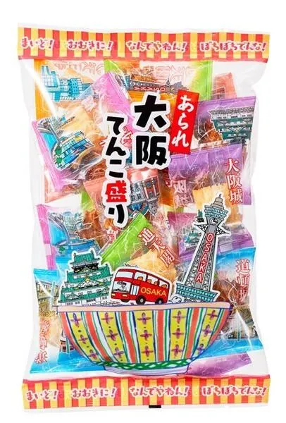 大阪の各名所を印刷した個包装のあられです。大阪土産に是非どうぞ!! 大阪風景あられは、マイクロウェーブ製法で中からもふっくら焼き上げた、サクサクのあられです。 原料の餅米は国産米100%。たまり醤油の「醤油味」とあっさりシンプルな「塩味」の2種類です。