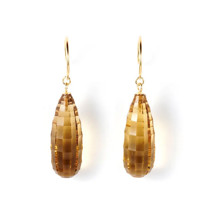 K18YG ビールクォーツ ピアス IGE-001E 揺れるたびにキラキラ輝くカービングがポイントのピアス デザイナーが厳選した天然石に、劣化の職人による繊細な加工が施され、仕上げられたジュエリー Made in Japan ※カットの石は一つ手作業でカッティング・カービングされています。画像のイメージと異なる場合がございます。デザインとして許容しております。一時ご了承ください。 ※照明の関係により、実際よりも色味が違って見える場合があります。 またパソコン・スマートフォンなどの環境により、いくつかの製品と画像の色が異なる場合もございます。予めご了承ください。 _モチーフ片側 H:約32mm W:約7.5mm (おおよそのサイズ)