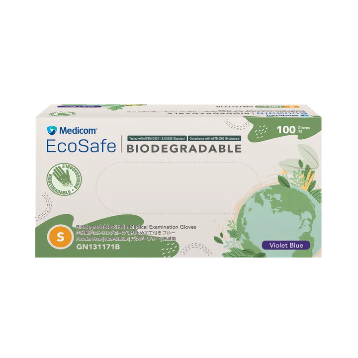 メディコム「エコセーフ」生分解性ニトリルグローブは環境への影響を考慮して開発された 生分解性のニトリルグローブです。 地球と共に生きることを選択した私達のひとつの答えがここにあります。 ●環境に配慮した生分解性  ASTM D5511高固体嫌気性消化条件下における生分解性試験において、  490日以内に約81%の生分解性能を示しました。 ●メディカルグレードの強度と伸張性  500%以上の伸張性を有しており、抗がん剤等の薬剤への耐性も高く、  EN455メディカルグレードに適合しております。 ●高い安全性(USフードグレード、天然ゴムラテックスフリー)  原料に天然ゴムを含まないため天然ゴムラテックスアレルギーの心配がございません。  また、HACCP対応、厳しい基準の米国の食品規格にも適合しています。(US FDA21 CFR177.2600) ・全長:230mm以上 ・掌部厚み:0.08mm以上 ・指先厚み:0.05mm以上 ・カラー:ブルー ・製造:マレーシア ●入数 ・100枚/箱 ・10箱/ケース ラテックスフリー パウダーフリー 左右兼用 内側塩素処理加工 滑り止め 生分解性 未滅菌