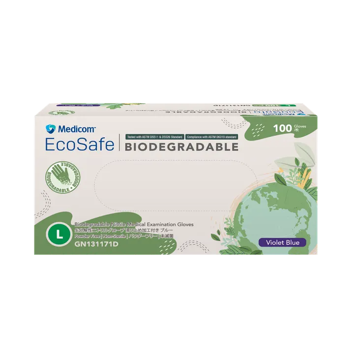 メディコム「エコセーフ」生分解性ニトリルグローブは環境への影響を考慮して開発された 生分解性のニトリルグローブです。 地球と共に生きることを選択した私達のひとつの答えがここにあります。 ●環境に配慮した生分解性  ASTM D5511高固体嫌気性消化条件下における生分解性試験において、  490日以内に約81%の生分解性能を示しました。 ●メディカルグレードの強度と伸張性  500%以上の伸張性を有しており、抗がん剤等の薬剤への耐性も高く、  EN455メディカルグレードに適合しております。 ●高い安全性(USフードグレード、天然ゴムラテックスフリー)  原料に天然ゴムを含まないため天然ゴムラテックスアレルギーの心配がございません。  また、HACCP対応、厳しい基準の米国の食品規格にも適合しています。(US FDA21 CFR177.2600) ・全長:230mm以上 ・掌部厚み:0.08mm以上 ・指先厚み:0.05mm以上 ・カラー:ブルー ・製造:マレーシア ●入数 ・100枚/箱 ・10箱/ケース ラテックスフリー パウダーフリー 左右兼用 内側塩素処理加工 滑り止め 生分解性 未滅菌