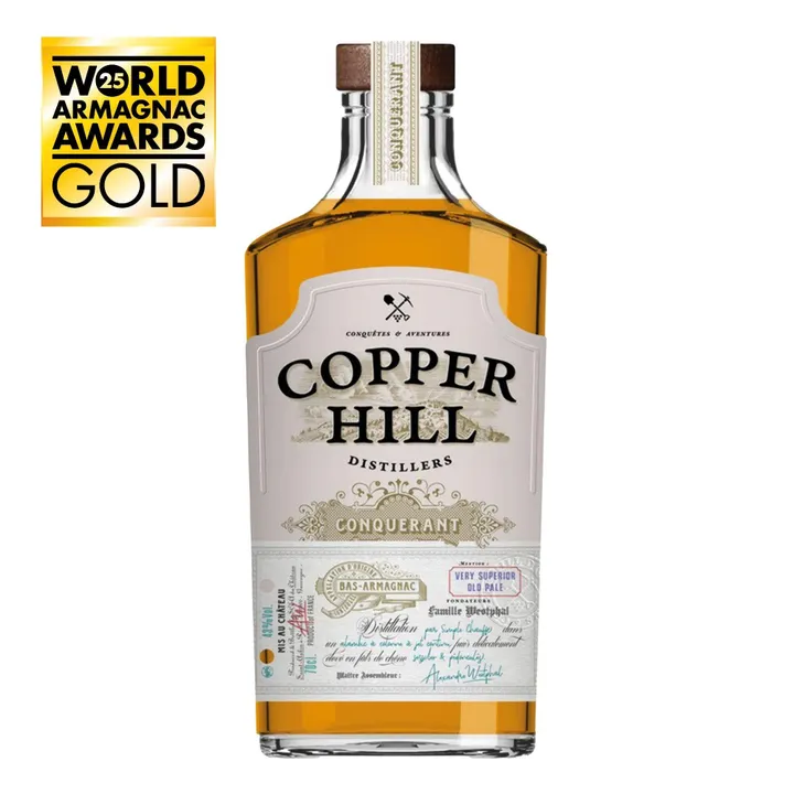 Copper Hill は、バ・アルマニャックの中心地、ジェール県サン=トーバン城で造られるコンテンポラリーなアルマニャックブランドです。アルザス出身のウェストファール家によって創設され、伝統的な職人技を尊重しながらも、大胆でモダンなアルマニャックのビジョンを体現しています。 コッパーヒル・コレクションの第二の表現となる VSOP は、伝統と現代性の調和を追求する上で新たな一歩を示すものです。オーク樽で最低4年間熟成されたこのアルマニャックは、バコ種とユニ・ブラン種のぶどうを使用し、穏やかなオークのニュアンスと時を重ねることで生まれる温かみを伴った、豊かなアロマの複雑さを楽しむことができます。 香り(Nose): 砂糖漬けのフルーツやバニラの甘やかな香りに、プラムややわらかなスパイスがほのかに調和しています。 味わい(Palate): 口当たりは滑らかでシルキー。バランスの取れた味わいが広がり、トーストしたオークのニュアンスを帯びた温かく長い余韻が続きます