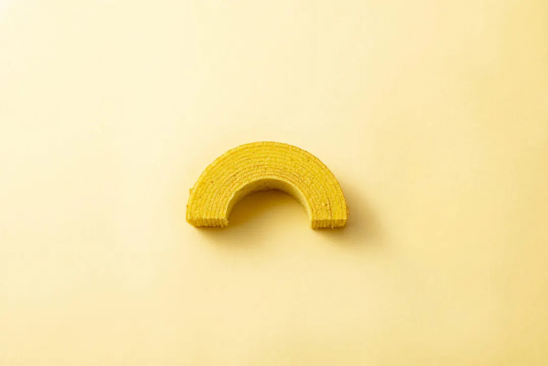 「淡路島の自然恵まれた大地から生まれた、上質な鶏卵、濃厚な牛乳、そして香り高い米粉が織り成す至福のバウムクーヘン。 しっとりふんわり食感 ばななフレーバーのバウムクーヘン。