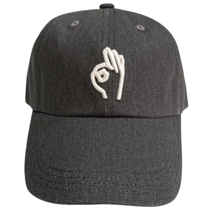 弊社お馴染みのハンドサインを大きく3D刺繍したキャップ。アジャスターはリフレクター入りのドローコード。本体の素材は目の細かいキャンバス地です。