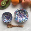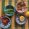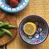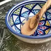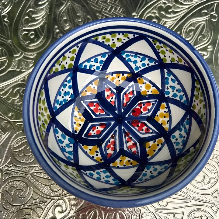 サイズ:約φ10×高さ4.5cm ※デザインは入荷時により多少異なることがございます。 チュニジアで陶器の町といえば「ナブール」 鮮やかな手つきでロクロを回し、その後で皿に絵付けをしている女性の手つきの見事さに感嘆。 たくさんある中でもよりすぐりの皿ばかりを選んでおります。 *「ナブール」は観光客だけでなく、チュニジア人でも陶器を買いに行くときは「ここ!」、というほど陶器の街として知られています。 この町の工場で職人が1点1点鮮やかな手つきでロクロを回し、皿に絵付けをしている女性の手つきの見事さに感嘆します。 中心から放射線状に広がる模様は、ほとんどの工房がこの柄で絵付けするほどオーソドックスです。 色鮮やかな文様は食べたあとでも食卓を華やかに演出してくれます。 *400年以上歴史のあるチュニジア伝統の絵付け陶器の街ナブールから、地中海の風をお届けします。 *ナブールは瀬戸市と姉妹都市です。