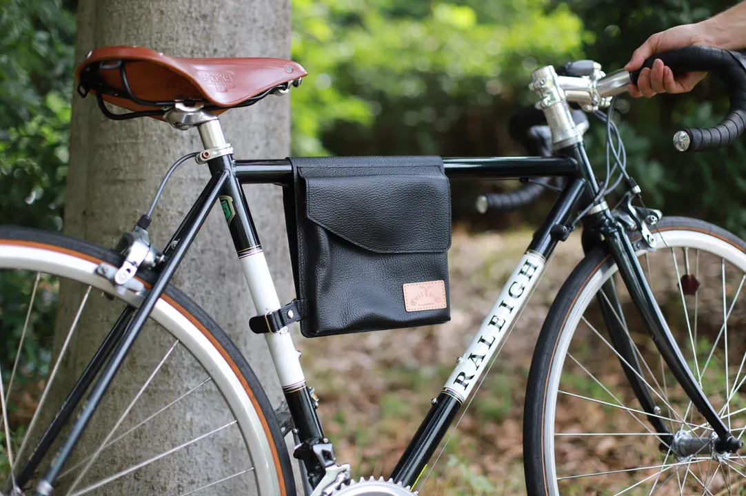 自転車のフレームに取り付けることで、スマホやお財布などの小物を収納できるようになります。 パンツのポケットに入れることで漕ぎづらかった自転車に乗る時のストレスを、おしゃれに解決。防水レザー仕様なので、ちょっとした雨であれば中身が濡れることもありません。泥はねなど汚れにも強いため、従来のお手入れや気遣いも不要です。