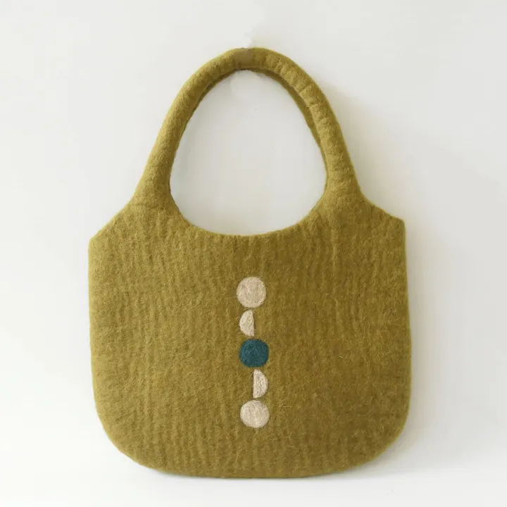 大き目のぽってりした形のフェルトバッグ。正面に月の満ち欠けをイメージしたモチーフを。内ポケット付。