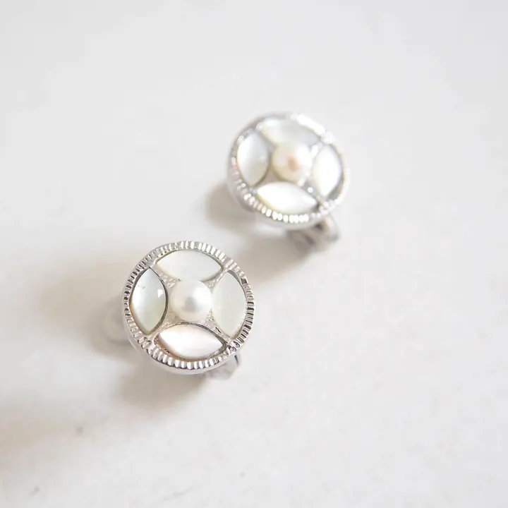 イヤリング【Vintage】/淡水パール+マーキス白蝶貝ラウンドイヤリング クリーンなヴィンテージテイスト薫る シルバーカラーのコレクション ラフなスタイリングが映えるシーズンは アクセサリーもいろんな素材やカラーに挑戦できて、装う楽しみが湧き立ちますね。 少しカジュアルなコーデのときにも、きちんと見えするアクセサリーが耳元に光ると 何だかとっても安心できるし自信が持てるもの。 こちらのコレクションでは クリーンなシルバーカラーと天然素材との異素材MIXのアイテムでありながら ナチュラルに偏らずきちんと見えも叶ってしまう、イヤリング&ピアスが揃います。 ロジウムメッキによる落ち着きあるトーンのシルバーカラーと、天然素材の淡水パールやシェルの美しい輝きを活かし Oucaらしいヴィンテージテイストもしっかりと織り交ぜました。 特徴あるカラーや素材のテイストでも、これならオールシーズン手にとれる! そんな普遍的な魅力もプラスした、新鮮なシルバーカラーのアイテムたちです◎ ////////////////////////////// 天然素材 「マザーオブパール」の魅力 ////////////////////////////// 今回メインの素材として用いたのは 「マザーオブパール」と呼ばれる真珠をつくりだす母貝。 母貝にはいろいろな種類があることからマザーオブパールにも様々な色調が存在します。 パールのような美しい照りと光沢があり、透明だったり模様の斑だったり。 幾重にも重なる層が一つ一つ異なる表情で輝きます。 その柔らかなトーンの乳白色は上品でナチュラルな雰囲気も併せ持ち、 アクセサリーやジュエリーだけではなくボタンや時計の装飾などの日用品としても用いられています。 親しみある雰囲気の中にも、アクセサリーならではの美しさや特別感を丁寧に散りばめて、 ヴィンテージらしい面持ちもしっかりとプラスしながら仕上げました。 ◆詳細◆ 白蝶貝のマーキス型の小さなカボッションパーツを4つと淡水パールを用いたオリジナルモチーフのイヤリング。 落ち着きのあるシルバーカラーにパールや白蝶貝のカラーが上品にマッチし、 ミル打ち風のテクスチャーを施したヴィンテージテイスト薫る枠の細やかさが引き立ちます。 4㎜ほどの小ぶりな淡水パールのまわりに白蝶貝をぐるりと配することで、 お花のようにも、タイルのような幾何学柄にも感じられたりと、美しく凛とした表情がとってもクール。 中心の淡水パールがさりげなく艶めき程よく甘さもプラスされて、 カジュアルな装いにもフォーマルなシーンにも、さりげなく華を添えてくれるような きちんと見えの叶う万能なイヤーアイテムに仕上がりました。 こちらのアイテムで使用したのは、 天然素材「マザーオブパール」の中でも輝きが美しい白蝶貝と呼ばれる種類の貝。 他の貝と比べて透明感のある真珠のような光沢と虹色の輝きが強く楽しめるのが魅力で 華やかさと人気がひときわ高いのがこの白蝶貝です。 金具はクリップタイプ。 シリコンカバーも装着しやすく、快適にお使いいただけます。 ピアスタイプ(EN145P)もございます。 商品には専用のBOXが無料で付属しますので、ギフトにも最適です◎