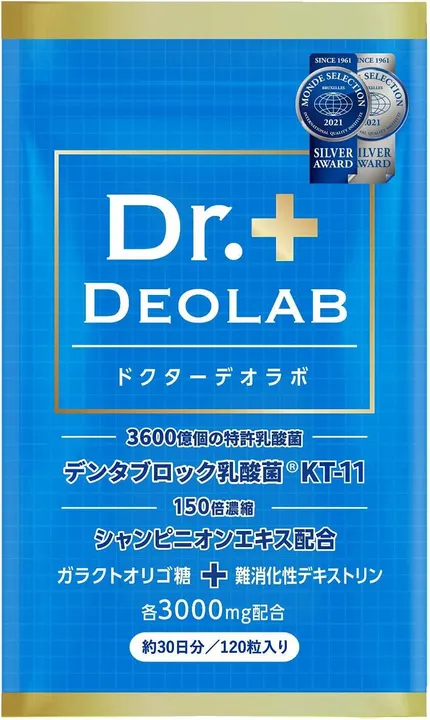 【トリプル配合でインナーケア】 濃縮シャンピニオンエキスを3,000㎎、さらに特許成分乳酸菌「KT-11」3,600億個、オリゴ糖、食物繊維を配合。日々の健康を内側からサポートします。(栄養補助食品) 【製薬会社と共同開発】 製薬会社のノウハウを活かして製造したサプリメントです。お客様に信頼性の高い製品をお届けするため、品質はもちろん、原料選定から製造に至るまで、徹底的にこだわりました。 【美容・健康成分を 配合】 メイン成分の他に、緑茶カテキン、ザクロエキス、バラの花びらエキス、生コーヒーエキス、柿エキス、その他濃縮りんごエキスを配合し、日々の美容と健康をサポートします。 【国内GMP認定工場で製造】 ドクターデオラボは、厳正な品質管理基準をクリアした国内のGMP認定工場のみで製造しております。 【製品仕様】 ・120粒 1日4粒 約30日分 錠剤タイプ ・開封後はチャックをしっかり閉め、直射日光・高温多湿を避けて保存してください。 ・体調・体質により、まれに合わない場合がありますので、その場合はご使用をお控えください。 ・疾病治療中の方、及び妊娠・授乳中の方は、医師にご相談の上ご利用ください。 ・水濡れや汚れのつかない衛生的な環境でお取り扱いください。 ・食物アレルギーのある方は、原料名をご確認の上ご使用をお決めください。
