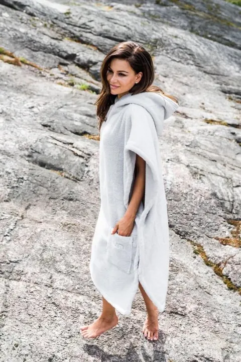 <商品説明> ・横を開けて、上からかぶるタイプ。横はスナップで2か所ずつ留めます。フード付き。 ・やや厚手のふかふかコットン。肌触りが心地よく、高級感があります。 ・吸水性がよく、厚手なのに(体感的に)乾くのは遅くはありません。 ・洗濯乾燥に強く、丈夫で長持ちします。ふかふかも長持ちします。 ・サウナー向け:サウナ上がりに使用するポンチョですが、ふかふかタオルの部屋着としてもお使いいただけます。 ■サイズ展開:S/M/L 丈が10cmずつ違います。 ■カラー展開:5色(ホワイト・ベージュ・グレー・パールグレー・ローズ) ■生産国:トルコ製(フィンランドデザイン) ■素材:綿100%(エコテックスクラス1認証済) ■取り扱い:洗濯機乾燥機可。柔軟剤不可。 ■添付品・国内加工・商品説明シール貼付(日本語)商品内容、素材、取扱注意記載。 ■梱包サイズ:縦38x横26x厚10 重量:約1kg ■発注個数:1個から可。 <日本での販売> 日本では、リカトレーディングビューロー合同会社(名古屋)が独占販売権を持ち、2017年から輸入販売を開始しました。 全国百貨店のポップアップを中心に、小売店、オンラインショップ、カタログギフト、ホテル、温浴施設、サロン、ショウルームなどに卸しています。 展開売場は、北欧、バストイレタリー、タオル、婦人服雑貨、サウナスパ、ビューティーなど、幅広く展開可能です。品揃えなど、ご相談ください。