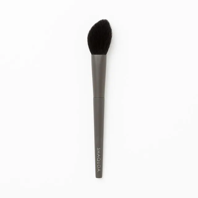 斜めに整えた穂先が顔の曲面や目の周りの凹凸にしっかりフィットするハイライトブラッシュ。天然山羊毛と人工毛をブランドしたシャクダオリジナルの穂先は、ハイライトカラーをさらっと薄づきに仕上げるとともに、立体感のある表情をつくります。ハンドルの裏面には、置いた時に転びにくいシャープなカットを施しています。