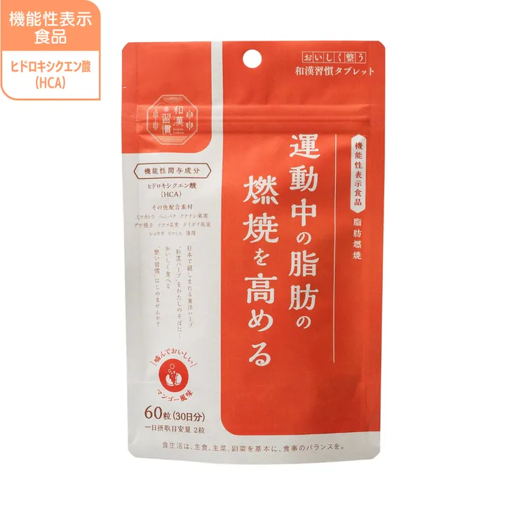 日本で親しまれる東洋ハーブ”和漢ハーブ”を中心に、植物のチカラを凝縮したタブレットです。 おいしく食べる”整い習慣”はじめませんか? ヒドロキシクエン酸(HCA)を配合した機能性表示食品です。 噛んで食べるタブレットのため、水なしでお召し上がりいただけます。 シュワっとはじける炭酸べースにフルーツの風味がついていますので、和漢特有の癖も少なく、お口のリフレッシュにも最適です。 トロピカルな甘みのマンゴー風味。 【機能性表示食品】 届出表示内容::本品にはヒドロキシクエン酸(HCA)が含まれます。 ヒドロキシクエン酸(HCA)には、運動中の脂肪の燃焼を高める機能が報告されています。 届出番号:I271 機能性関与成分:1日2粒(1800mg)当たり ヒドロキシクエン酸(HCA)250mg 【植物抽出エキス配合】 ※和漢原料9種の抽出エキスを配合しています。 食生活は、主食、主菜、副菜を基本に、食事のバランスを。 ※本品は、事業者の責任において特定の保健の目的が期待できる旨を表示するものとして、消費者庁長官に届出されたものです。 ただし特定保健用食品と異なり、消費者庁長官による個別審査を受けたものではありません。