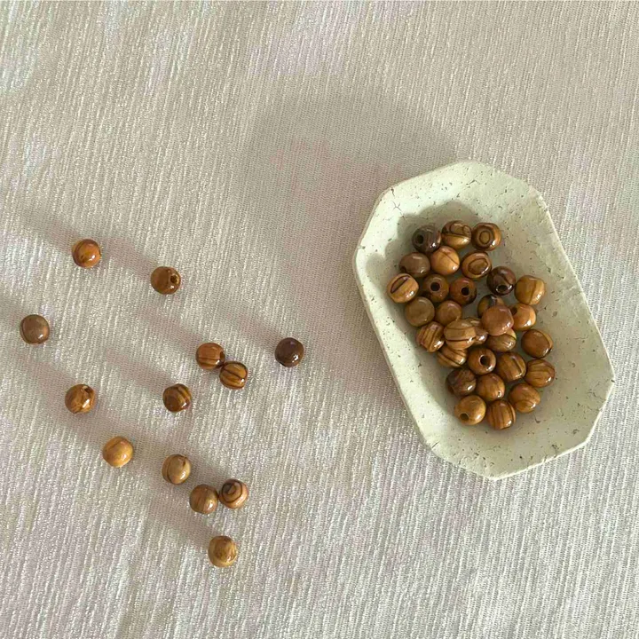 中東パレスチナで剪定木材(オリーブ)から作られたウッドビーズ。 タッセル(布)、ガラスビーズ、パール、石、メタル、あらゆる素材に合う、DIY好きに人気の商品です。 アクセサリーを販売している方から、親子での作品作りまで、幅広く活用いただいています。 10個単位ですがおまとめ可能なのでチャットにてお知らせください。 貴店でのウッドビーズを使った作品制作(商用OK)も大歓迎です! ◆素材の「オリーブ」について 生産地パレスチナでは紀元前からオリーブが栽培されており、樹齢数千年の古木も生えています。5-7年で実を付け始め、30~50年経つと生育を助けるために収穫の後に剪定されます。生産団体では主に50年以上の木の剪定材を使用しています。枝や幹は木材業者へ、あるいは農家から直接工房に渡り、工芸品・日用品に生まれ変わります。小さな材も捨てることなく冬場の燃料に利用されています。 ◆「架け箸」について 架け箸は「素敵に国境はない」をモットーに、フェアトレードで商品開発・セレクト・販売を行うパレスチナ雑貨専門店です。実際にホームステイをして触れた現地の人や文化の魅力を手仕事を通して発信するとともに、木製品の手入れや、天然素材と人の手が掛け合わさった歪さを暮らしに取り入れる楽しみをお伝えしています。 世代、性別を問わず手に取っていただけるような日用雑貨、台所用品、文具などを常時約40種類ほど扱っており(在庫数や原価の関係で、goooods未掲載のお品もございます)、対面販売や、自社EC、卸でのお取り扱いのほか、これまでに阪急阪神百貨店や名鉄百貨店、松屋銀座での催事にも出店しています。 ◆本商品の生産団体「Holy Land Handicraft Cooperatives Society」について 中東で一番古い世界フェアトレード連盟(WFTO)加盟団体。パレスチナ(ベツレヘム・西岸地区)で2000人の地域のコミュニティを支えており、コロナ禍を乗り越え、現在も町の柱である観光収入が全く入らない中、海外との取引を続け離職者を出さないよう職人をサポートしています。