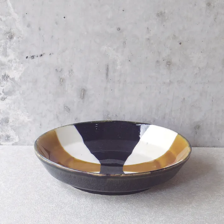 ガパオライスやカレー・ジャージャー麺が食べたくなる平丼。一点一点伸び伸びと掛けられた十字の呉須と飴色釉薬が遊び心あふれたうつわです。 ■山正製陶所/土岐市駄知 昭和初期に土岐市駄知町に創業。100年近い歴史を持ち、手作業による削りや指押し、とちりなど仕上げの加飾に定評のある老舗の窯元。釉薬にもこだわり、セレン赤や油滴天目など日々研究に励んでいます。