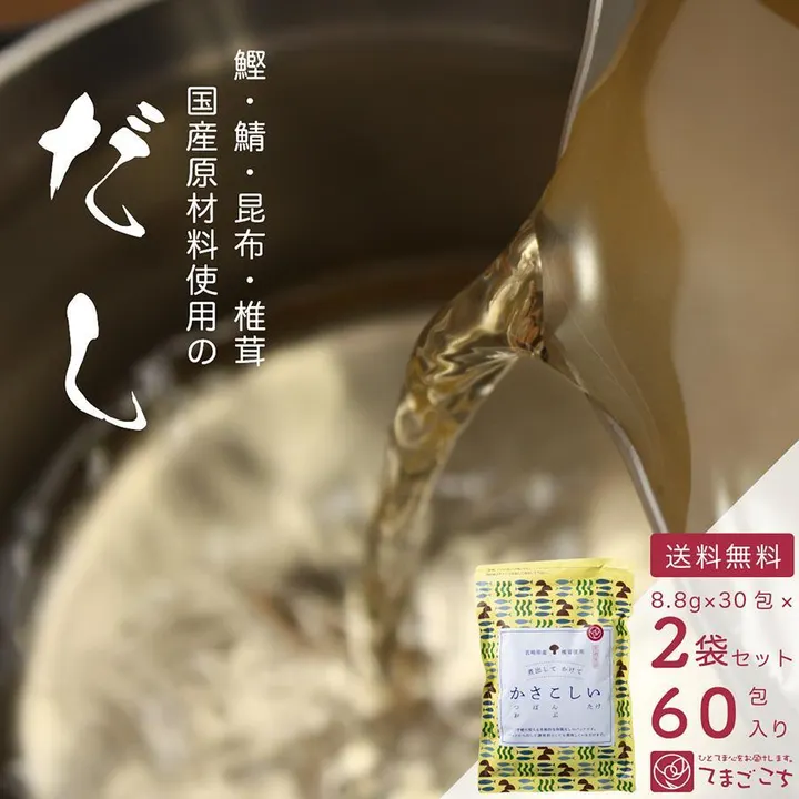 国産の鰹・鯖・昆布・椎茸を絶妙な黄金比でブレンドした『かさこしい』。この出汁パックを入れるだけで味噌汁や煮物が簡単に料亭の味に。粉末だしとしても◎。アレンジ自由自在! こだわりの国産素材である鰹、長崎県産の鯖、北海道産の昆布、宮崎県産の椎茸をふんだんに使い、絶妙な黄金比のブレンドによる深い味わいが魅力のだしパック。カツオやサバのあく、昆布の粘りをパックがこし取り、すっきりと澄んだ出汁に。だしパックを鍋に入れるだけで味噌汁や煮物や鍋が簡単に本格的な料亭味に仕上がります。 パックの中身を取り出して、そのまま粉末だしとしてもご使用いただけます。お吸い物、煮物、炊き込みご飯、味噌汁、茶碗蒸しやそば、うどん、天つゆなど様々な料理にご利用いただけます。 原材料:食塩(国内製造)、砂糖、鰹節粉末、煮干うるめ鰯粉末、鯖節粉末、鰹だし顆粒、粉末醤油、椎茸粉末、昆布粒、食用植物油脂/調味料(アミノ酸等)、乳酸カルシウム、(一部に小麦・さば・大豆を含む) 内容量:264g(8.8g×30包入り)×2袋セット 保存方法:直射日光を避けて、常温で保存してください。開封後は冷蔵して下さい。 製造者:宮崎食研有限会社(宮崎県宮崎市大字糸原4727)