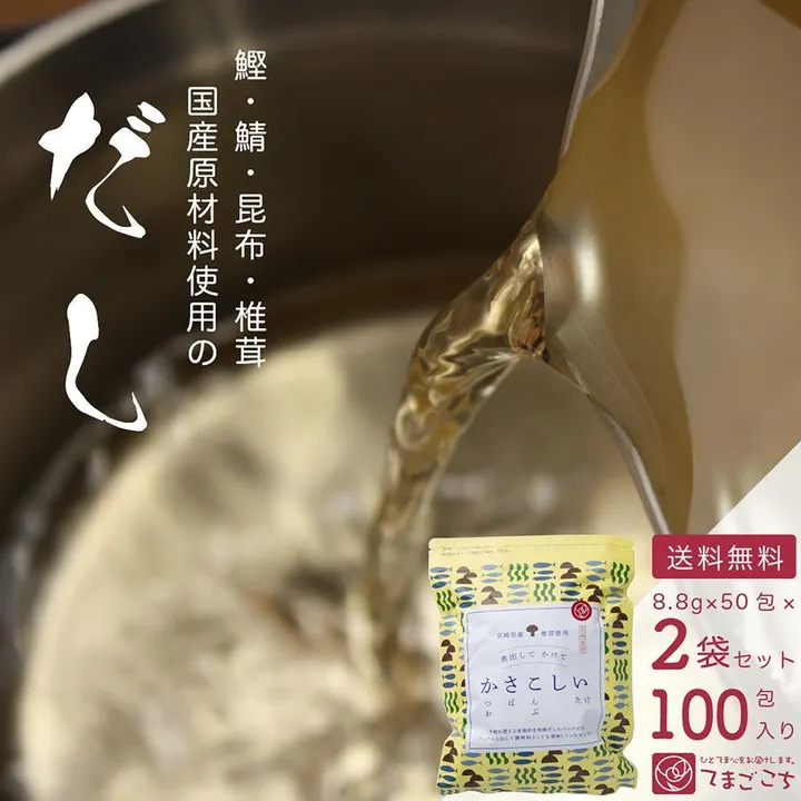 国産の鰹・鯖・昆布・椎茸を絶妙な黄金比でブレンドした『かさこしい』。この出汁パックを入れるだけで味噌汁や煮物が簡単に料亭の味に。粉末だしとしても◎。アレンジ自由自在! こだわりの国産素材である鰹、長崎県産の鯖、北海道産の昆布、宮崎県産の椎茸をふんだんに使い、絶妙な黄金比のブレンドによる深い味わいが魅力のだしパック。カツオやサバのあく、昆布の粘りをパックがこし取り、すっきりと澄んだ出汁に。だしパックを鍋に入れるだけで味噌汁や煮物や鍋が簡単に本格的な料亭味に仕上がります。 パックの中身を取り出して、そのまま粉末だしとしてもご使用いただけます。お吸い物、煮物、炊き込みご飯、味噌汁、茶碗蒸しやそば、うどん、天つゆなど様々な料理に使えます。 内容量:440g(8.8g×50包入り)×2袋セット 保存方法:直射日光を避けて、常温で保存してください。開封後は冷蔵して下さい。 原材料名:食塩(国内製造)、砂糖、鰹節粉末、煮干うるめ鰯粉末、鯖節粉末、鰹だし顆粒、粉末醤油、椎茸粉末、昆布粒、食用植物油脂/調味料(アミノ酸等)、乳酸カルシウム、(一部に小麦・さば・大豆を含む) アレルギー:一部に小麦・さば・大豆を含む 製造者:宮崎食研有限会社