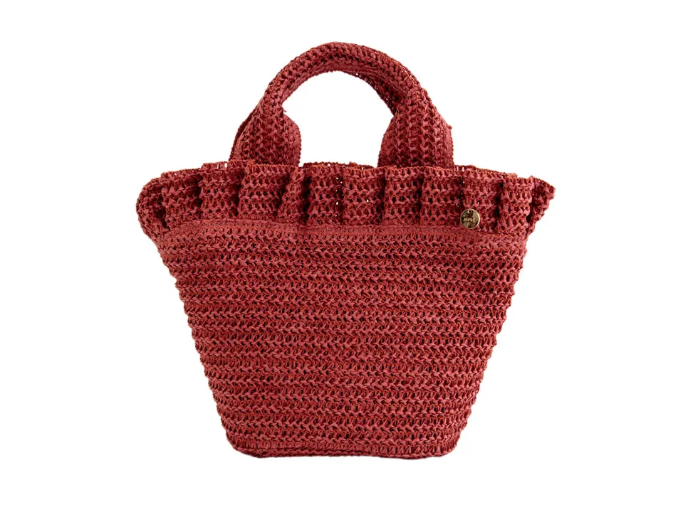 2026春夏バッグシリーズ、涼し気な雑材トートを中心に今年も“大人カワイイ”をたっぷりお届けします。 母の日のプレゼントにもぴったりのアイテムです。 ペーパーの編み地が軽やかな印象のミニトート。 開口部のさりげないフリルがデザインポイントです。 ディープなビビットカラーの展開にすることで、甘さを抑えつつ大人の女性でも持ちやすい雰囲気になりました。 裏地と内ポケットが付いて使い勝手◎ マグネットホック開閉で荷物の取り出しもスムーズに行えます。 オリジナル刻印のメタルチャームが大人っぽいアクセントに。 抑えた価格設定なので帽子やアームカバー、ハンカチなどと合わせたギフト提案強化商材としておすすめいたします!