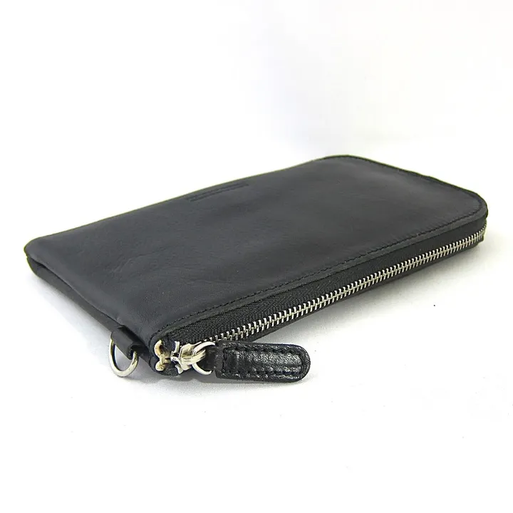 L字ファスナーの機能的なロングウォレットです。内側センターには FIANCHI VACHETTA(スムースレザー)製の大きなコインポケットを、両サイドにはそれぞれ4枚ずつ入るカードポケットを付けました。 パスポートや預金通帳も余裕で入るサイズなので旅行用ポーチや家庭での貴重品ケースとしても使っていただけます。 L字ファスナー式ですが、ジッパーエンドを底面まで伸ばしたので全体の開きが大きくなり、出し入れしやすくなりました。また外側にもファスナー式のポケットを付けたので、コインやキー等を収納していただけます。外側に付けたDカンには、ストラップ等を着脱出来ます。 素材は、外側にイタリア・サンタクローチェ地方のタンナー:アテナ社のバケッタレザー: INGRASATO(シュリンク)を使い、内側にはベージュカラーのピッグスキンを組み合わせました。 サイズ:約 180 × 105 × 20 mm(D環含まず) 外 側:INGRASATO(シュリンク) 内 側:FIANCHI VACHETTA(スムース) 裏 地:PIG SKIN(ピッグスキン) 色・柄:BLACK、BROWN、NATURAL 個 装:上下貼り箱
