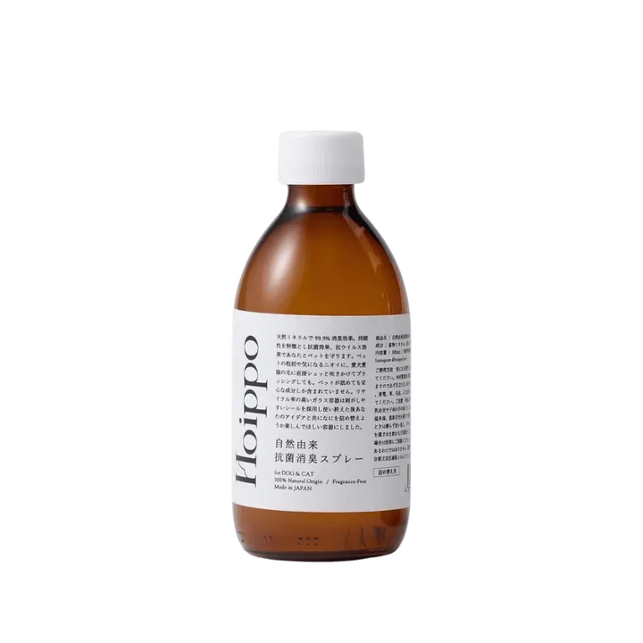 Hoippoの自信作、自然由来99.9% 抗菌消臭スプレー。 本製品の大きな特徴は、香りで誤魔化さない無香料と持続性のある消臭効果。その消臭効果は99.9%です。 高い消臭効果だけでなくコロナ菌やインフルエンザ菌、アルコール除菌効果の少ないノロウイルス菌などにも99.9% の抗菌抗ウイルス効果を発揮します。天然ミネラルと純水のみを含み、赤ちゃんから愛犬愛猫が舐めても問題のない優しさを兼ね備えています。 愛犬愛猫の粗相だけに限らず、被毛にシュッとかけてブラッシングしてもよし、 飼い主さまの日常に、焼肉やタバコ、汗のにおいにもお役立ていただけます。 容器は再利用しやすくリサイクル率の高いガラス容器から、割れが心配な方はプラ容器、たくさん使いたい方は業務用サイズまでご用意。 業務用サイズはプラ容器(空)を2本付属しています。容器を捨てる手間もなく好きな容器に入れることもできとても便利。 Hoippoの抗菌消臭スプレーはリピート率NO.1の商品です。