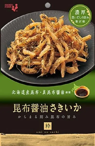 旨み広がる真昆布醤油をさきいかにからめました。 アクセントの刻み昆布がより一層風味を引き立て、深い味わいを楽しめます。